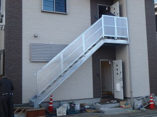 手摺りが付いて完成です。 スチール縦格子手摺り