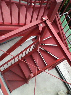 この階段は箱形回り階段です。ササラ:軽溝200x50 ステップ:縞鋼板3.2tZ曲げ有効巾600mm