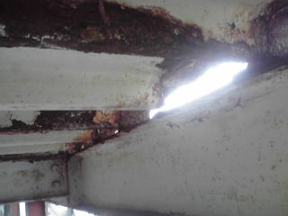 既存の梁の上に乗っかっているはずのデッキが腐食して強度を保てません。 今回、既存の梁の手前に、新たに梁を追加して床面の落下を防止しました。 |